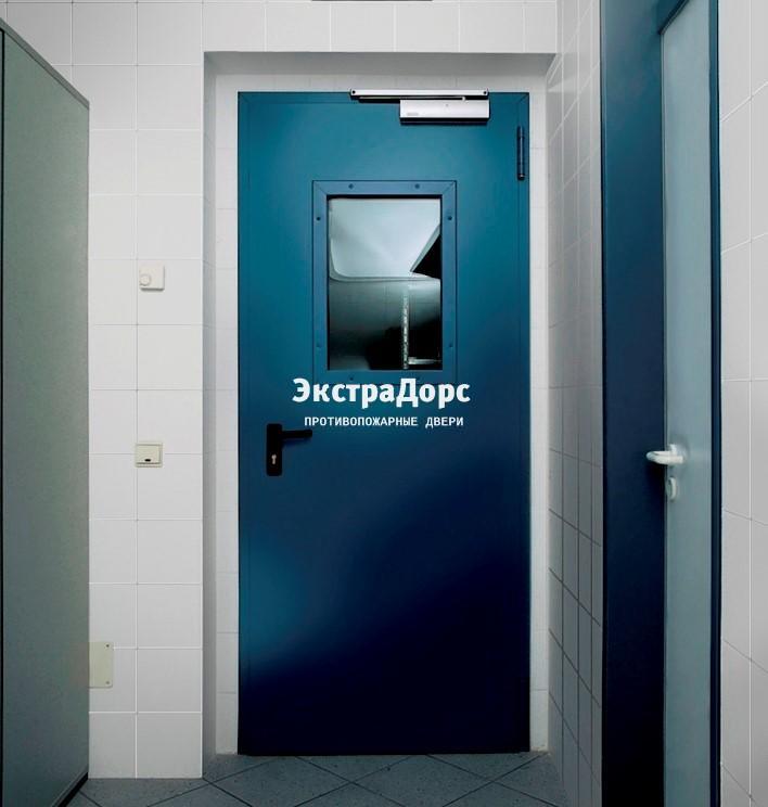 Противопожарная дверь 1 типа синяя c выпадающим порогом с остеклением в Одинцово