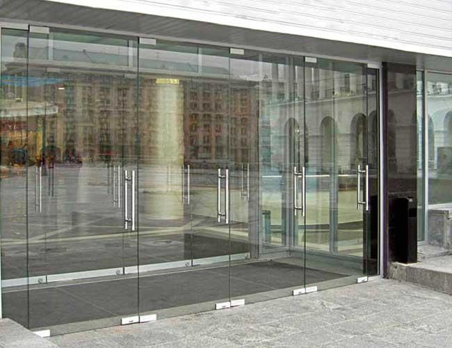 Противопожарная безрамная дверь со стеклом в торговый центр в Одинцово